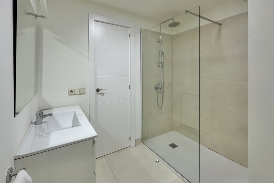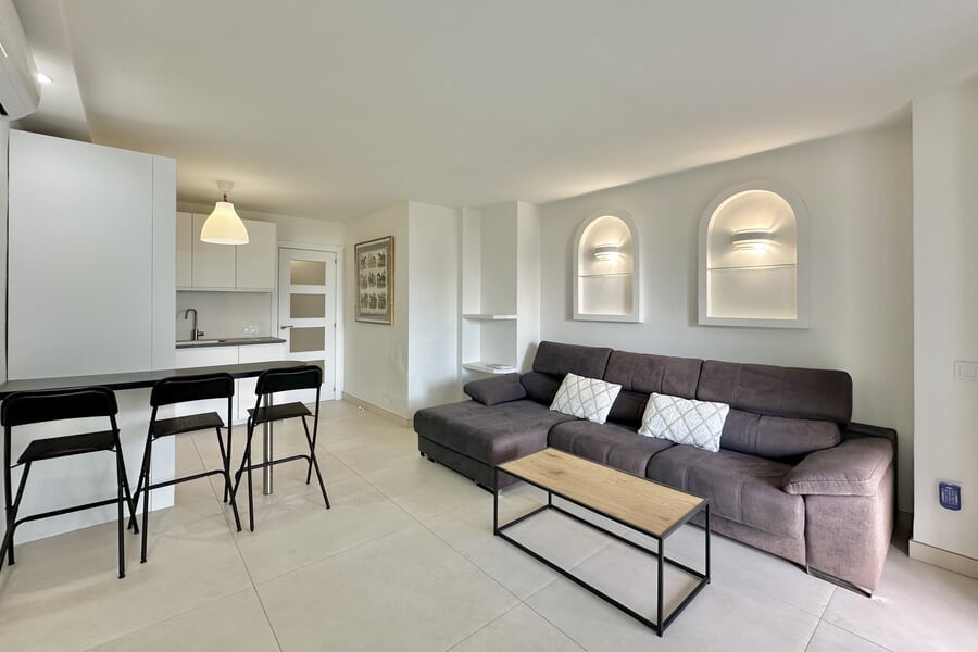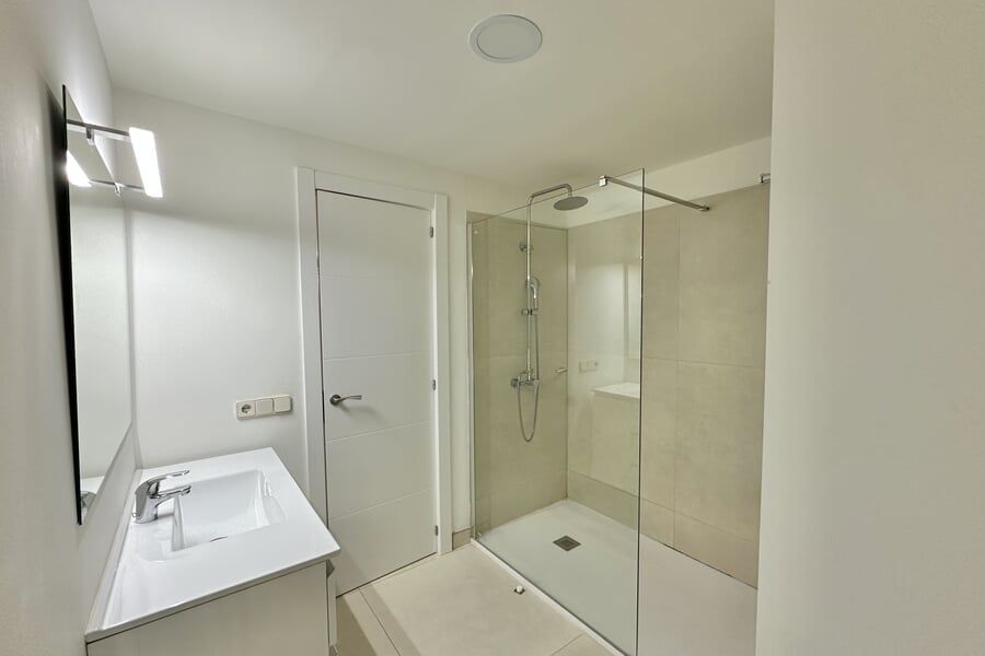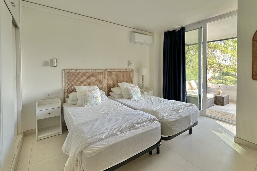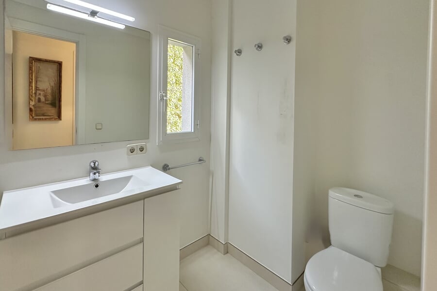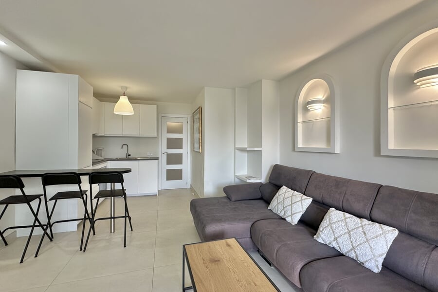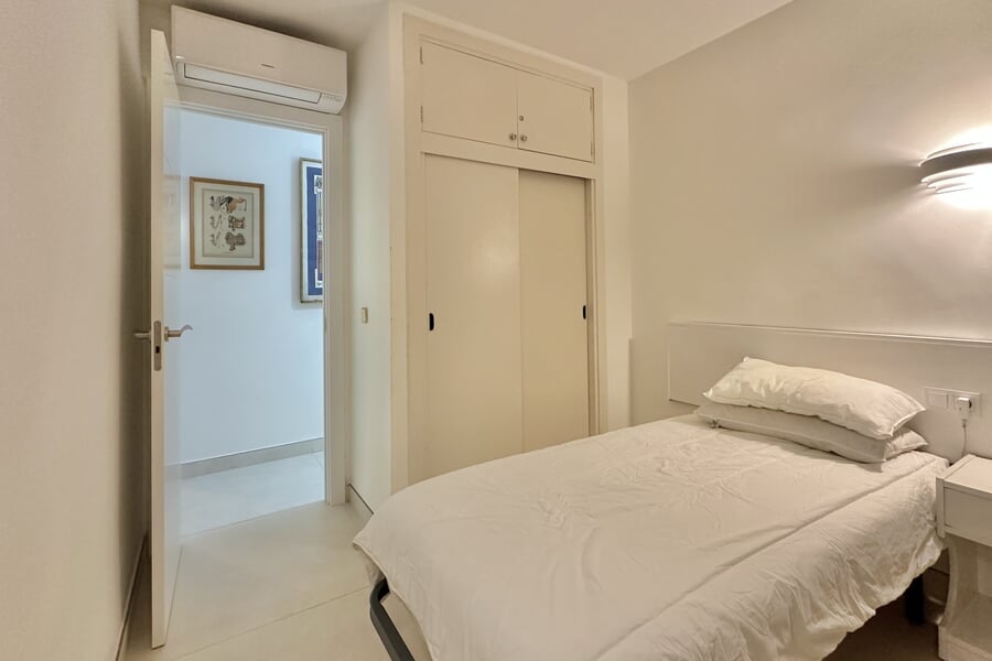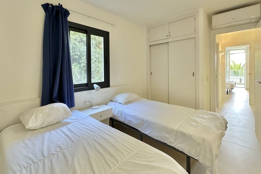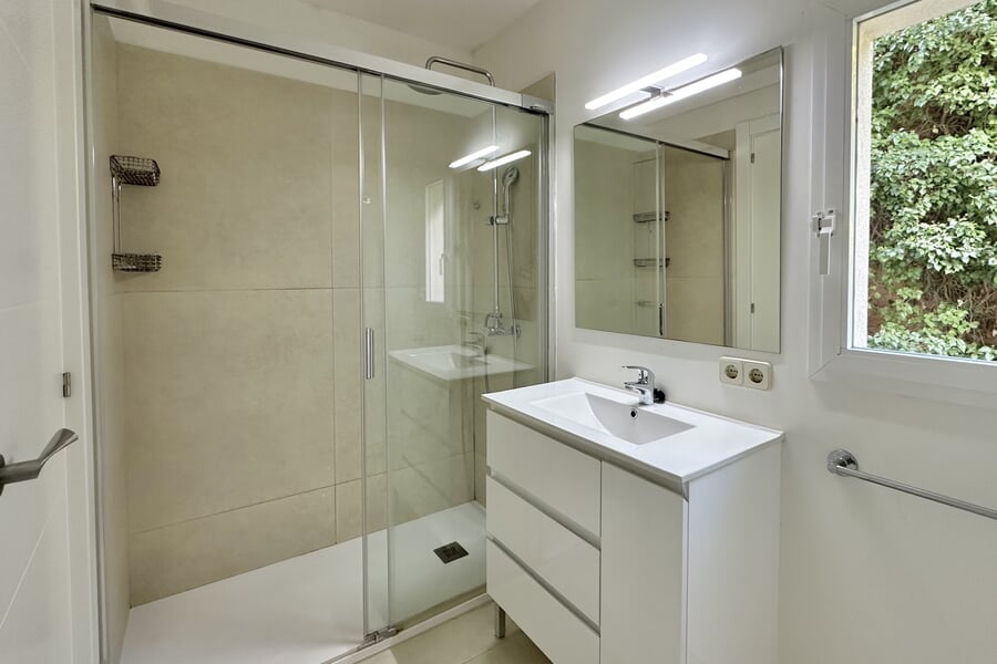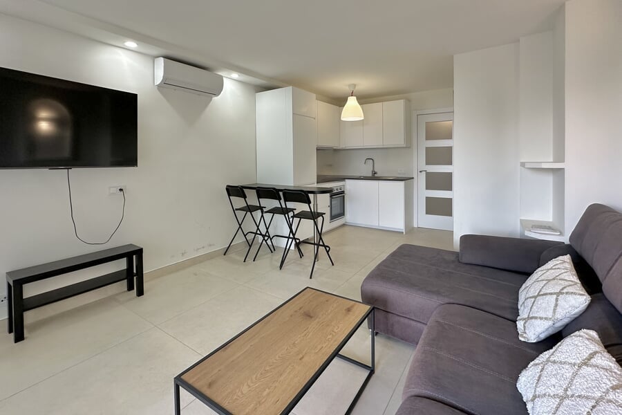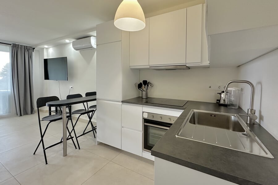The kitchen is equipped with an oven, ceramic hob, and dishwasher. Air conditioning (hot/cold) in all rooms ensures a comfortable indoor climate year-round.