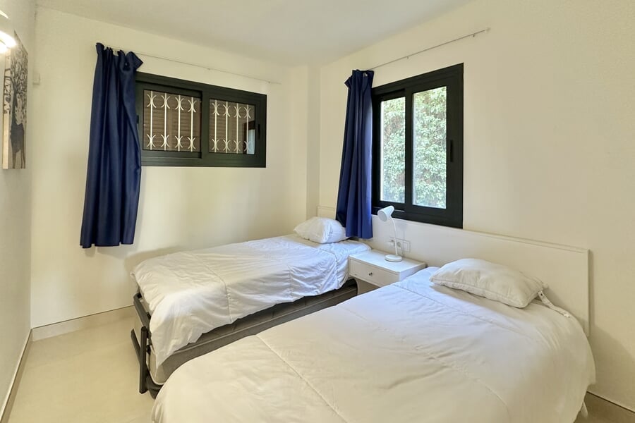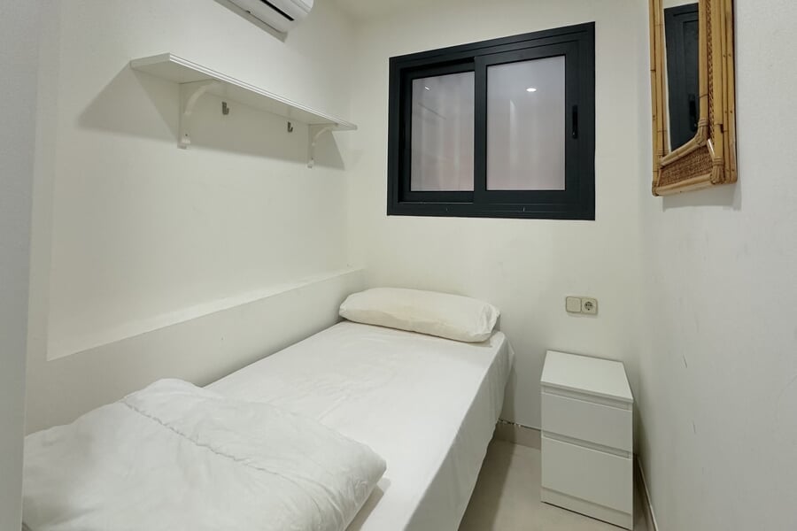 This apartment features a well-designed layout and practical amenities. A spacious balcony connects the living room with the master bedroom, providing plenty of natural light. It offers three bedrooms with single beds and two bathrooms with showers. A small laundry area with a washing machine is included, and the dryer is located on the balcony.