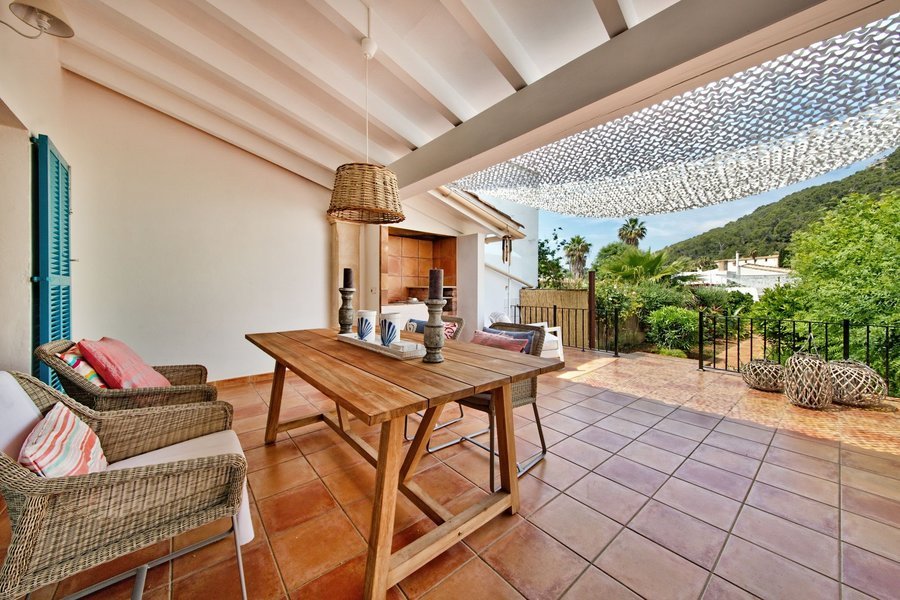 Available August and September. This townhouse in Andratx offers 216 sqm with west orientation (156 sqm living space). Quiet and with a beautiful garden of 252 sqm, it has 2 terraces of 60 sqm with barbecue area. Three bedrooms with bathroom en suite, guest toilet, high beamed ceilings, air conditioning, heating, dressing room, double glazing and closed parking in a lot in front of the house (also available for rent for 40€). The beaches of Cap del Mar and the charming beach club are nearby.