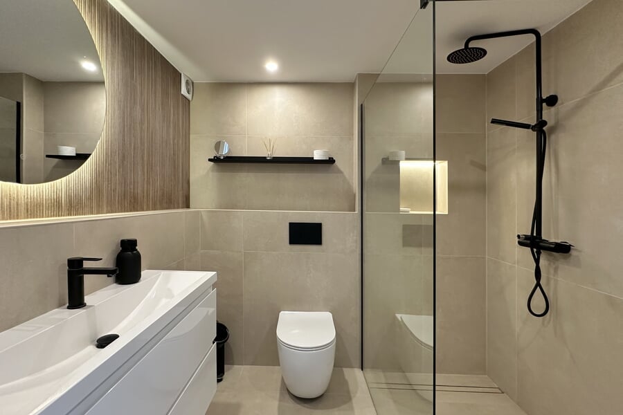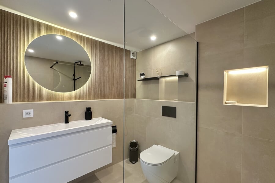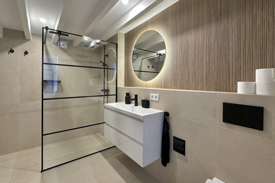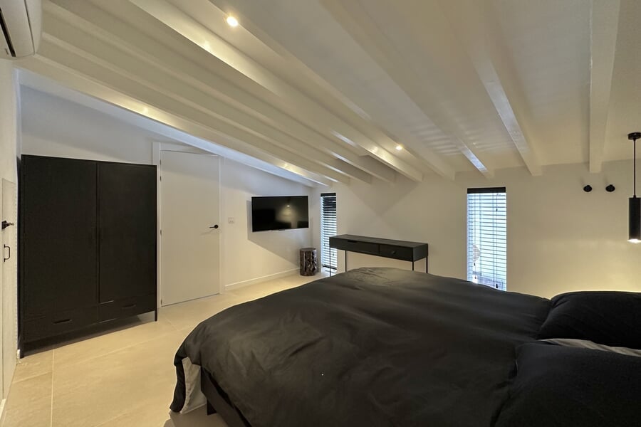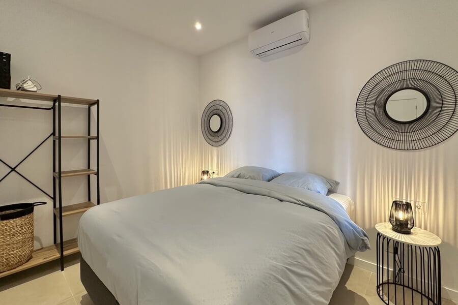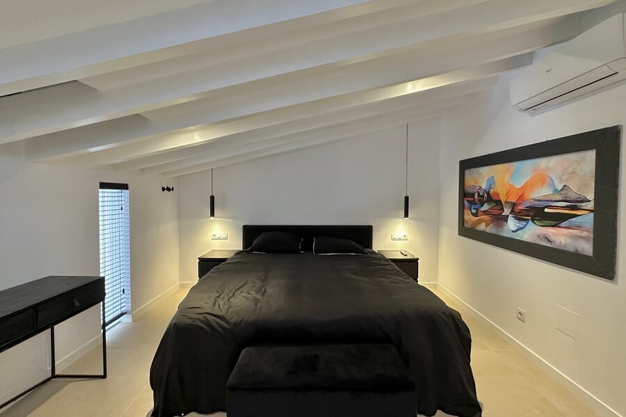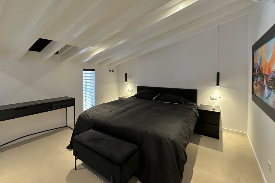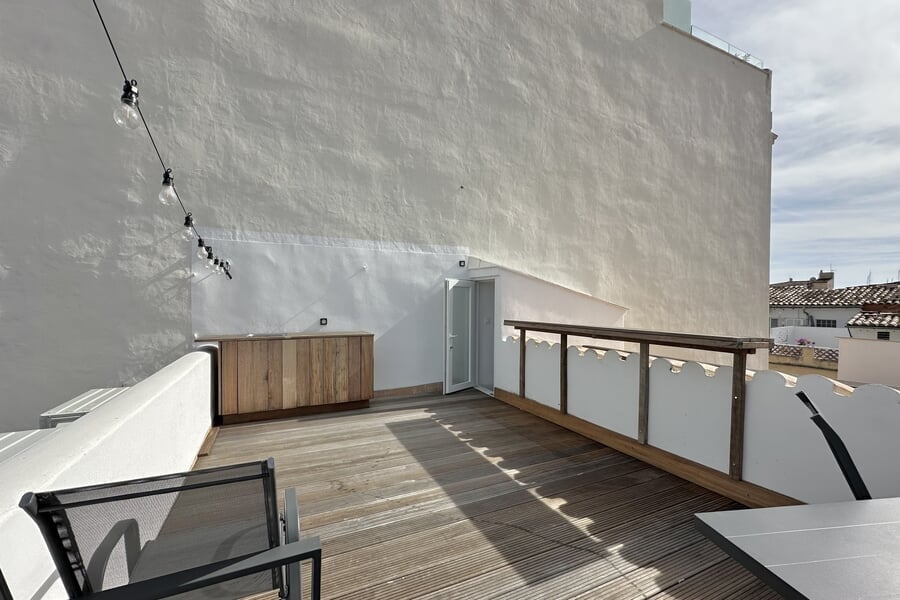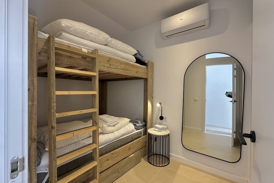 Available from January until the end of June. This modern property extends over two floors and offers four bedrooms (3 double beds, 1 bunk bed), two bathrooms, and an additional guest toilet. All bedrooms are equipped with air conditioning. The fully fitted kitchen includes an oven, dishwasher, fridge, and freezer. A washing machine and vacuum cleaner are also provided. A special highlight is the private rooftop terrace.