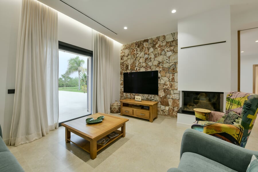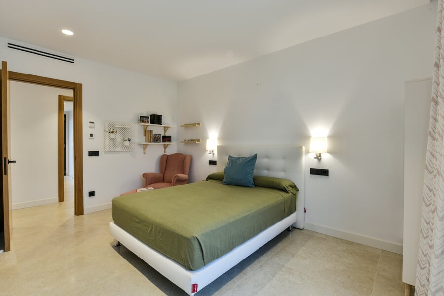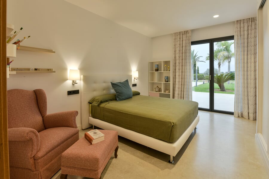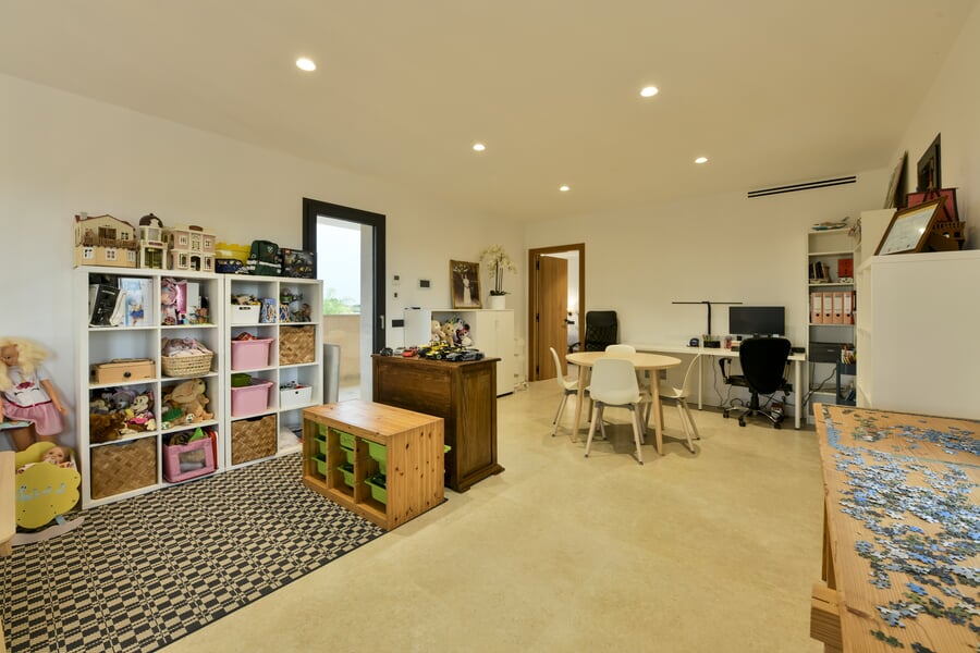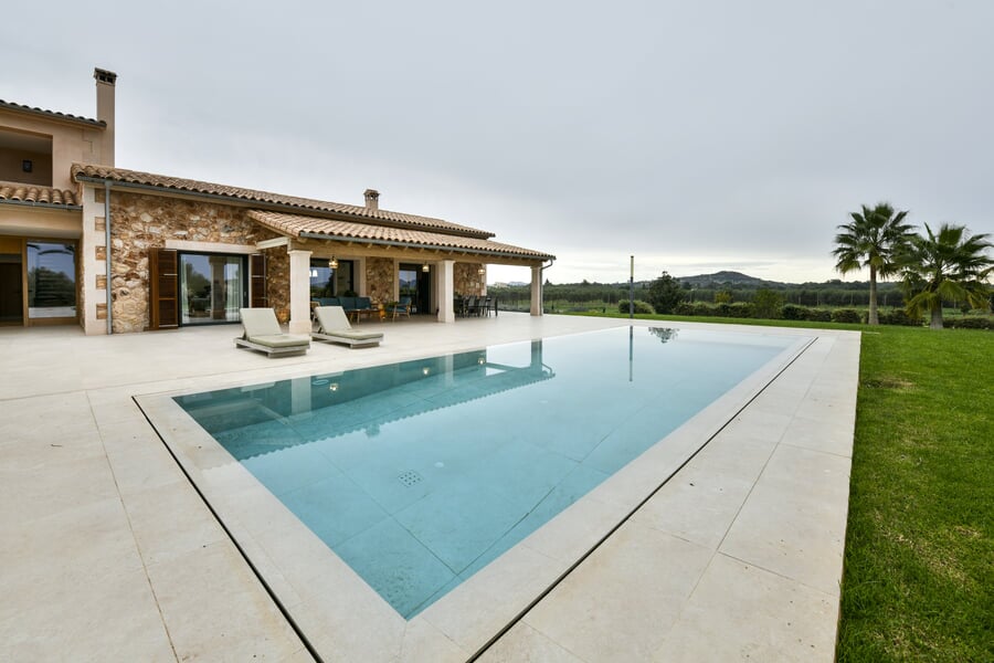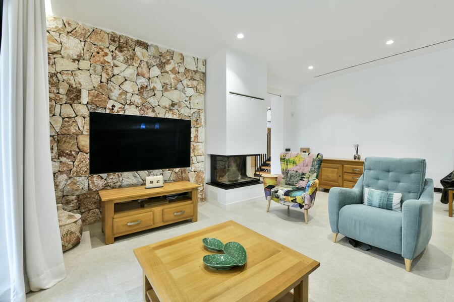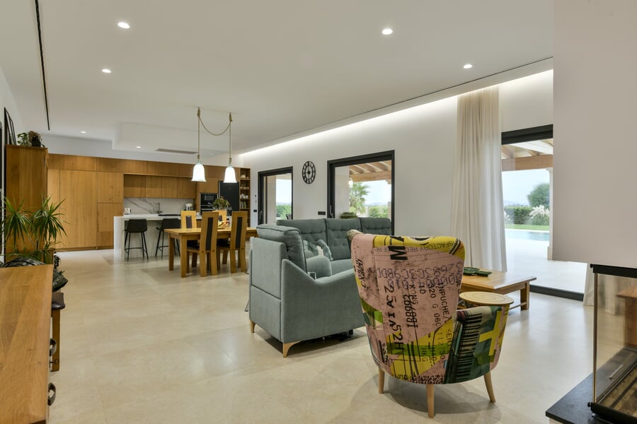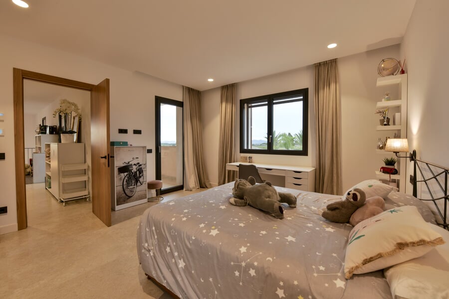 This modern and luxurious home features four spacious bedrooms and four elegant bathrooms, one of which is located directly by the pool. The outdoor areas offer a beautiful pool, expansive terraces, and a well-kept garden. The property is spread over two levels and is fully furnished. High-quality features such as underfloor heating, hot/cold air conditioning, and a solar energy system ensure maximum comfort. Behind the kitchen, there is also a separate room where utensils can be conveniently stored. A stylish, light-flooded home with an exclusive atmosphere.