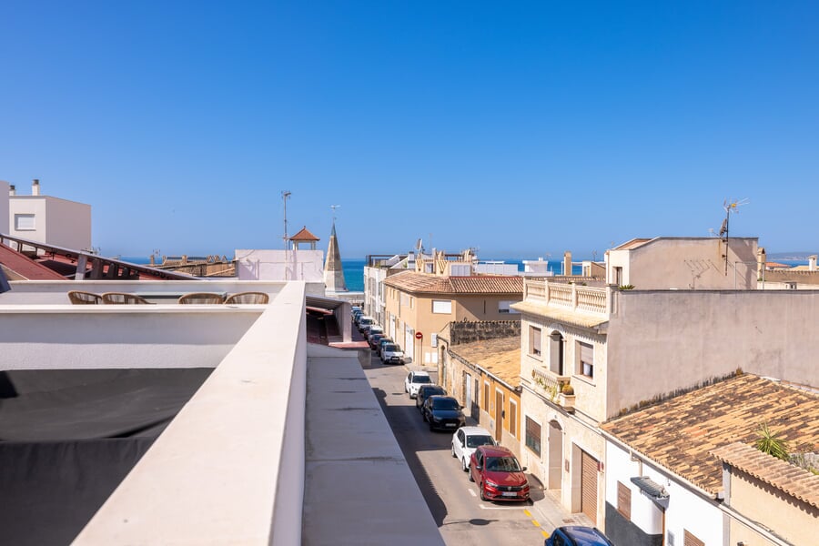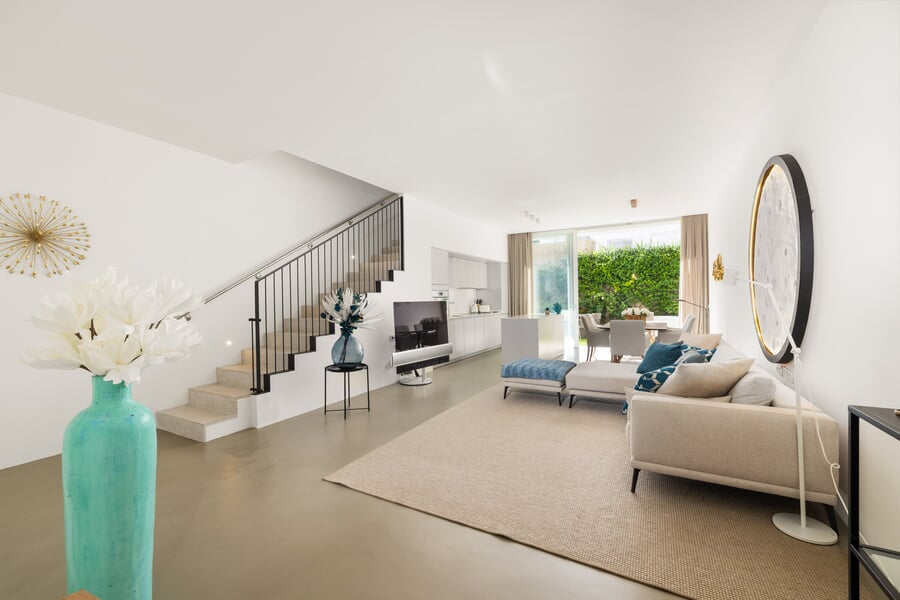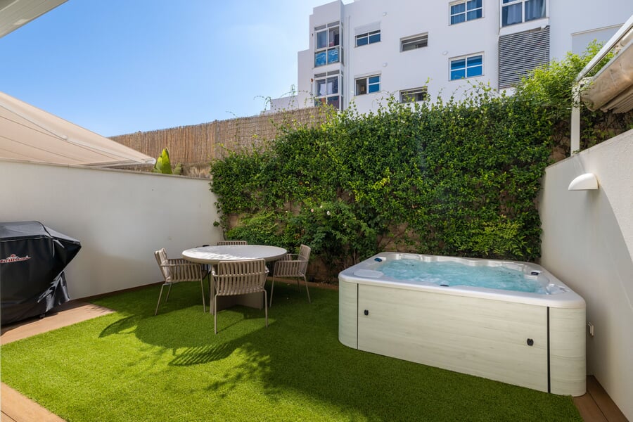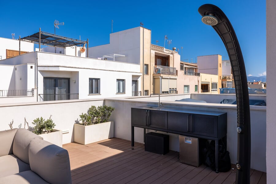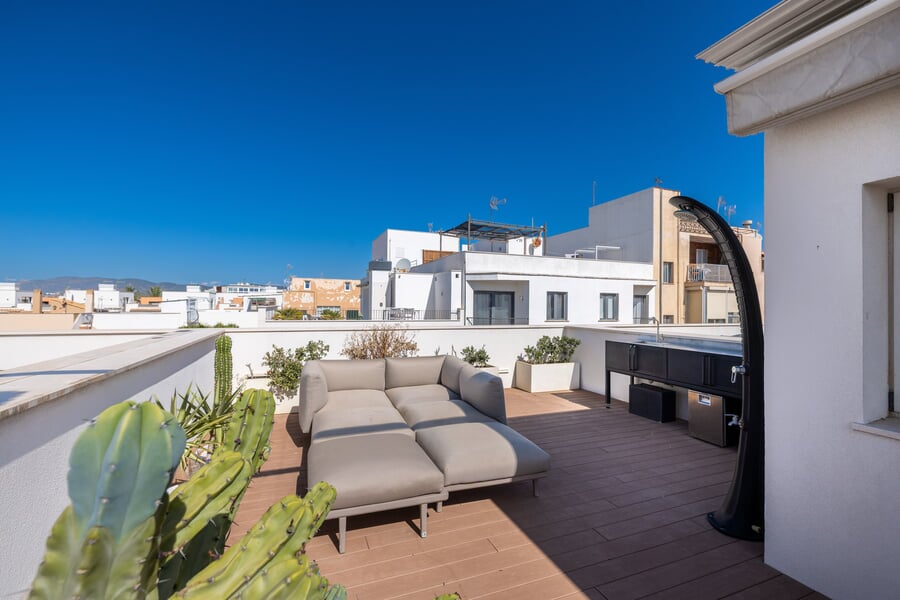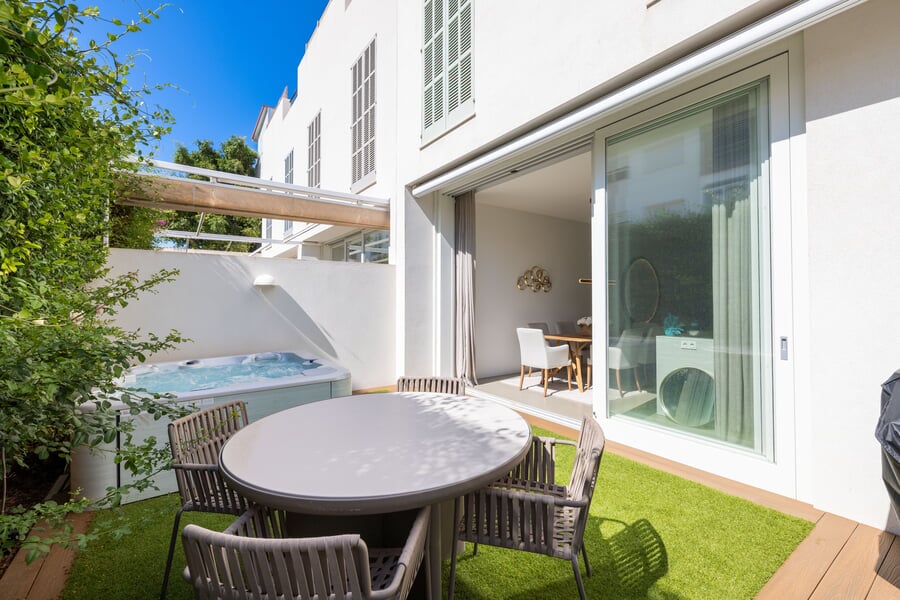 This stylish townhouse in the sought-after district of Molinar offers an exclusive living experience close to the sea on a total area of approx. 260 m². The two-story property impresses with a modern design featuring high-quality stone and concrete floors, as well as premium amenities including gas underfloor heating and central air conditioning. The heart of the house is the spacious, private patio with an integrated jacuzzi, creating a protected oasis of well-being. The upper floor comprises three comfortable bedrooms and three bathrooms, complemented by a practical utility room. A further highlight is the extensive roof terrace with an outdoor kitchen, offering wonderful views and making it ideal for social evenings. The property is rounded off by a garage for motorcycles or bicycles.