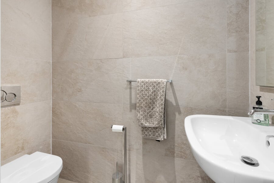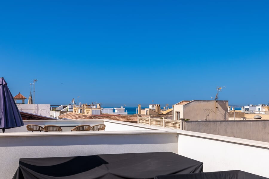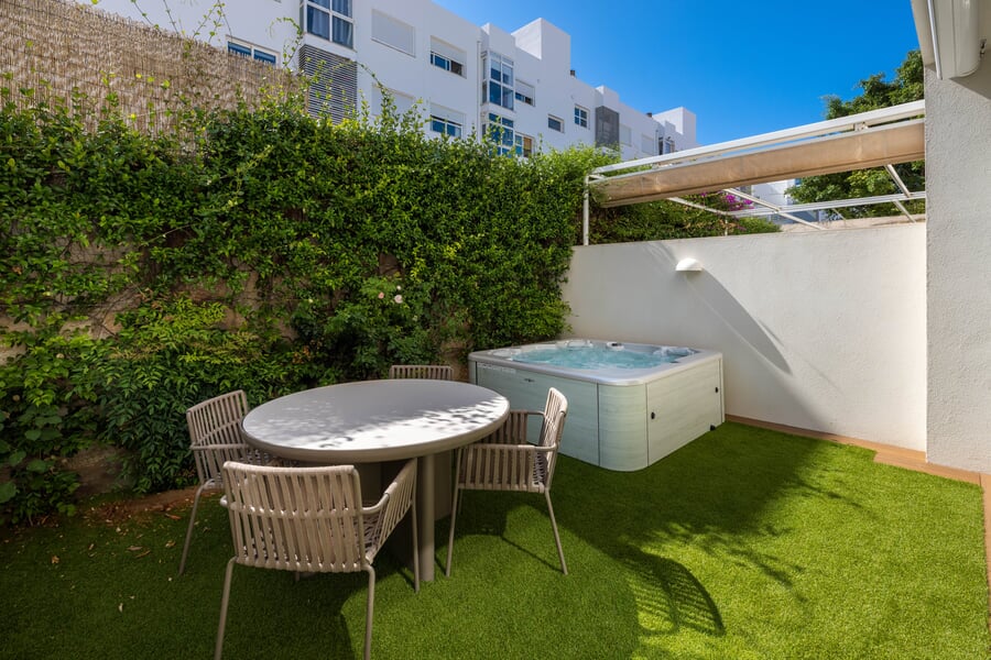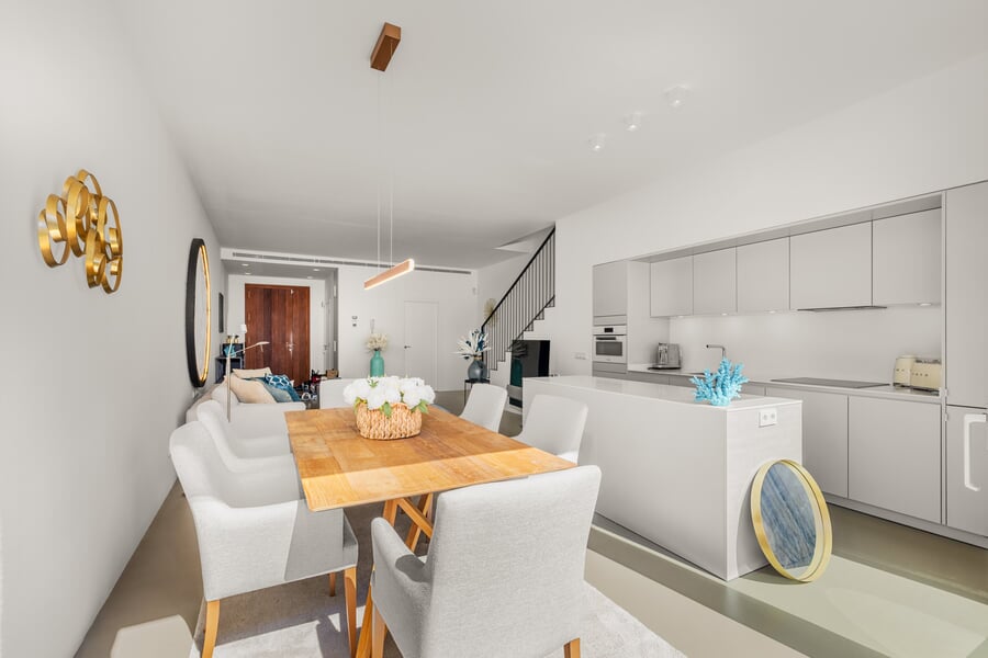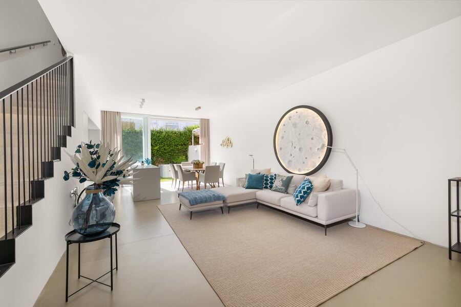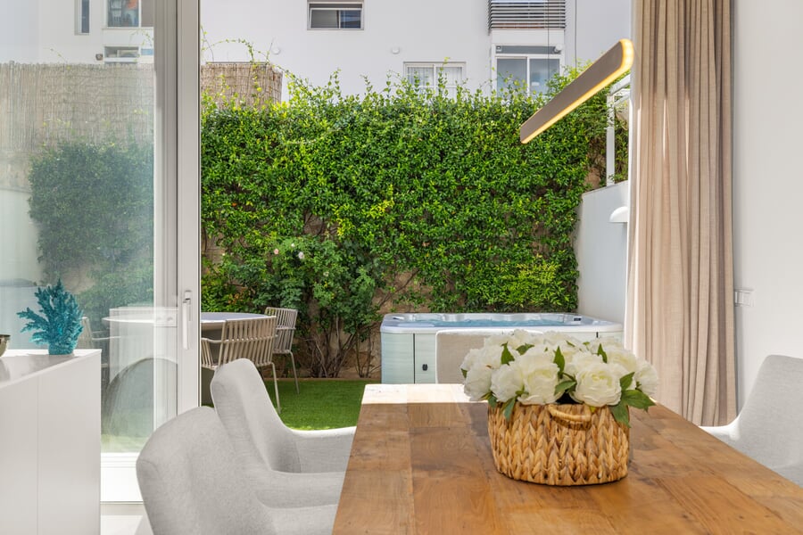 This stylish townhouse in the sought-after district of Molinar offers an exclusive living experience close to the sea on a total area of approx. 260 m². The two-story property impresses with a modern design featuring high-quality stone and concrete floors, as well as premium amenities including gas underfloor heating and central air conditioning. The heart of the house is the spacious, private patio with an integrated jacuzzi, creating a protected oasis of well-being. The upper floor comprises three comfortable bedrooms and three bathrooms, complemented by a practical utility room. A further highlight is the extensive roof terrace with an outdoor kitchen, offering wonderful views and making it ideal for social evenings. The property is rounded off by a garage for motorcycles or bicycles.